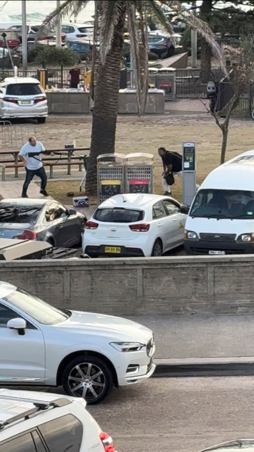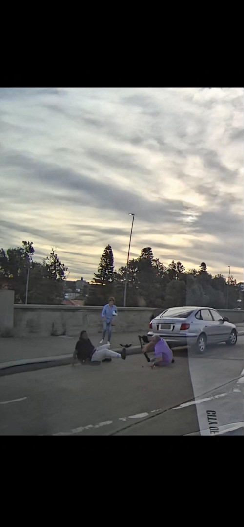The man in lavender, who is with a woman, gets up with the weapon as the footage moves on. Separate drone video shows the man and woman lying motionless next âto the vehicle beside the pedestrian bridge where the gunmen were later shot by police.
